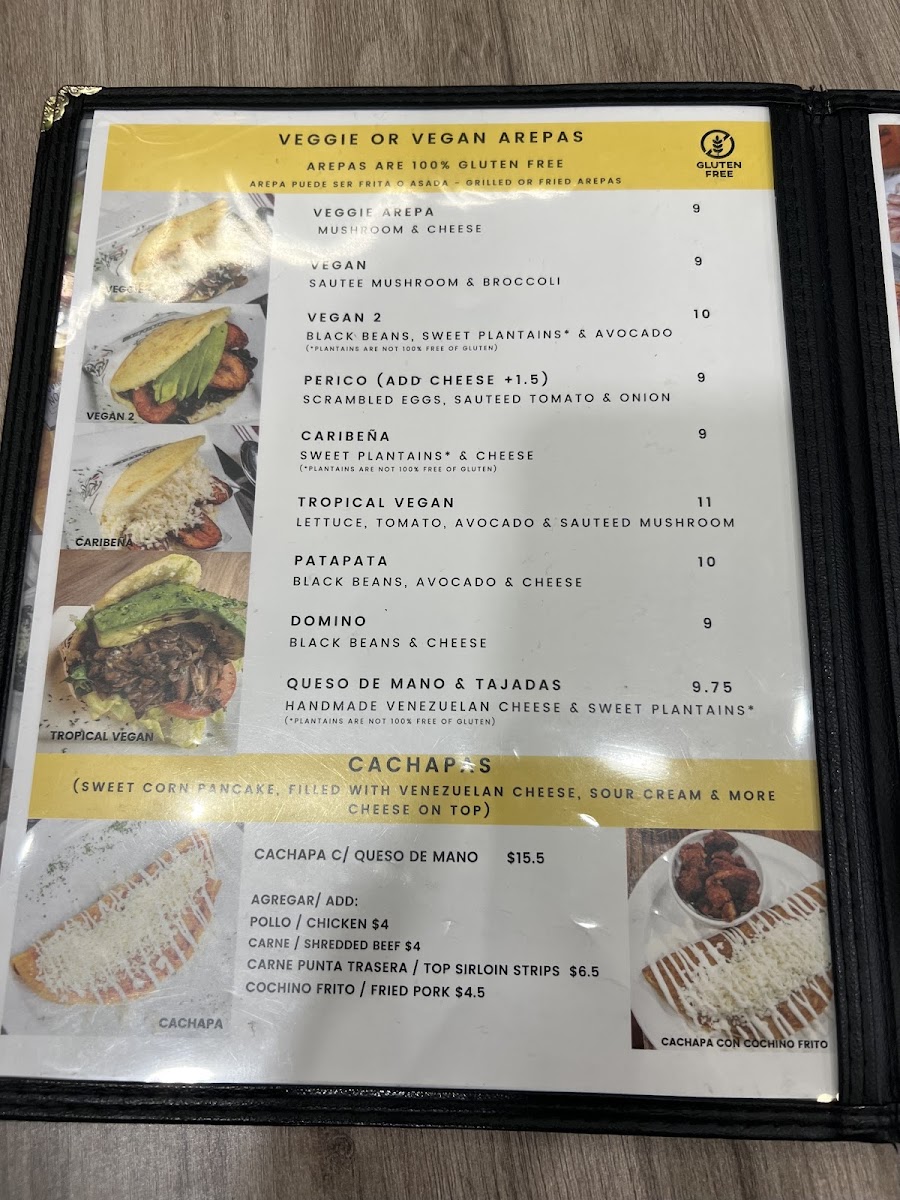 The menu is centered around their signature arepas, with highlights including the Pelua filled with shredded beef and Gouda cheese, and the Pabellon Arepa featuring a harmonious blend of shredded beef, black beans, and sweet plantains. For those seeking vegetarian options, try the Tropical Vegan Arepa packed with fresh vegetables.